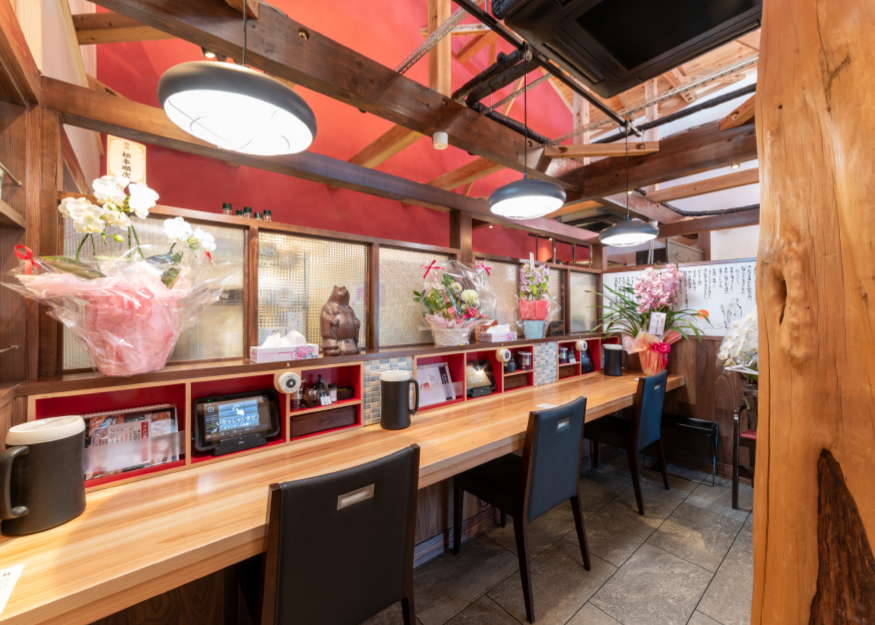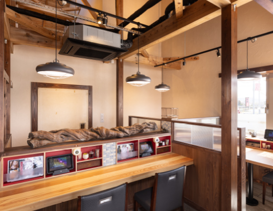 多様なシーンに応える広々とした空間 お一人様でも気兼ねなく楽しめるカウンターから、ご家族での団らんに最適なボックス席、最大50名様まで対応可能な大広間まで。車椅子のお客様もそのままご入店いただけるよう、広い通路を確保したバリアフリー設計となっております。