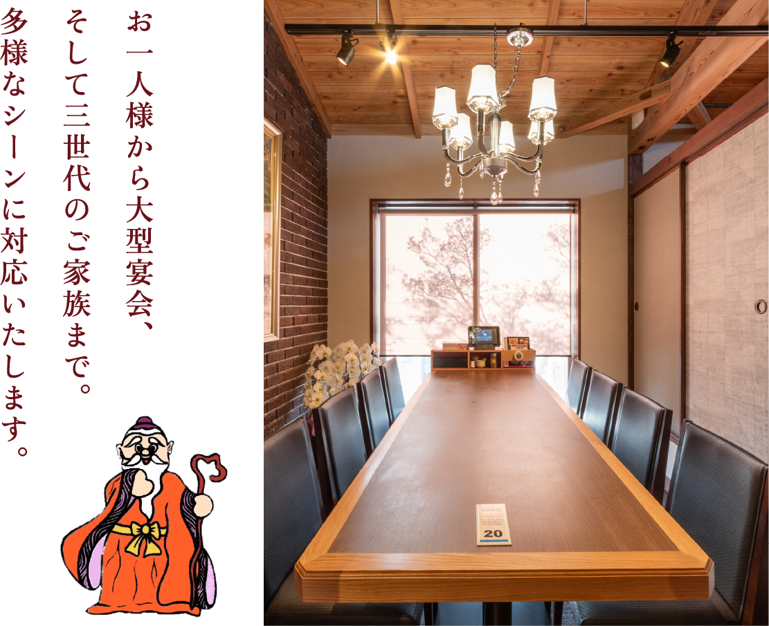 小さなお子様連れからお年寄りまで、どなたでも心置きなく本格中華を楽しんでいただけるよう、当店は車いすのままご入店いただけるバリアフリー設計となっております(専用の車いす用トイレも完備)。
