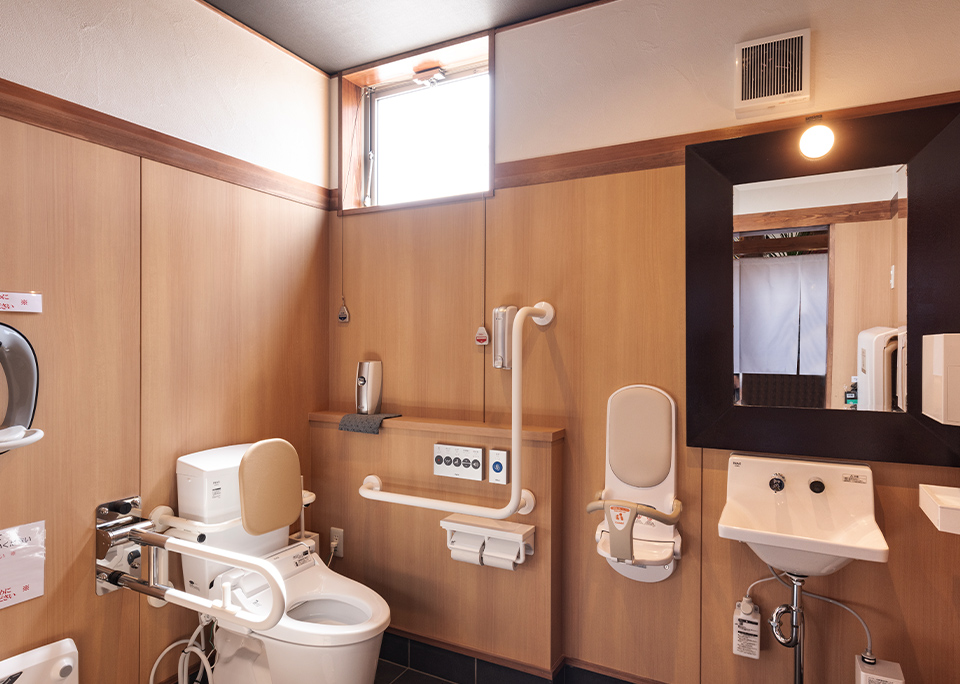 どなたでも安心してご利用いただける、広々とした専用トイレ 小さなお子様連れの方や、お身体の不自由な方、お年寄りまで、すべてのお客様に安心してお食事を楽しんでいただきたい。そんな想いから、手すりや十分なスペースを確保したバリアフリー対応のお手洗いを完備しております。